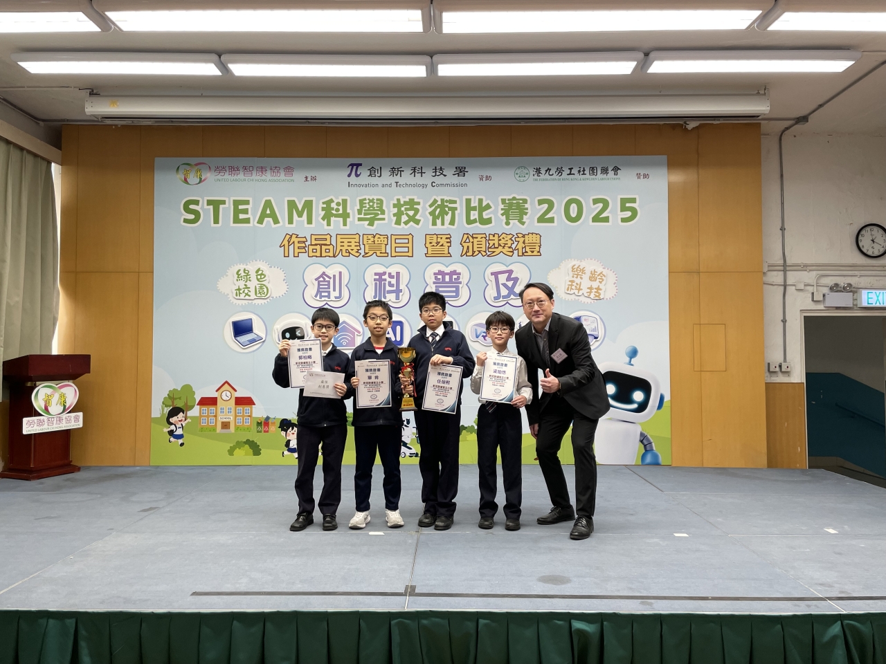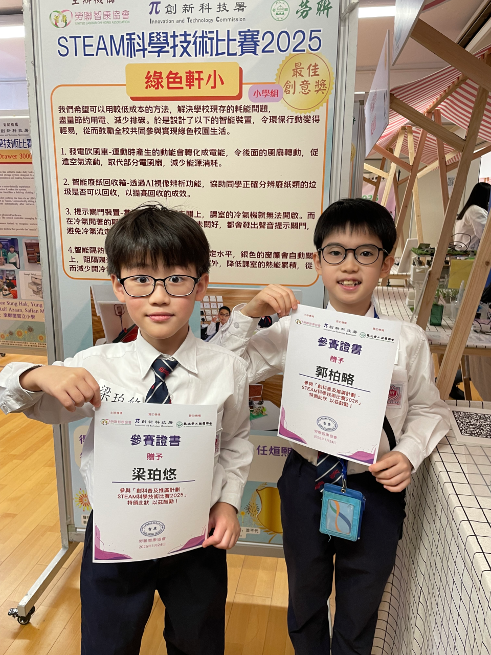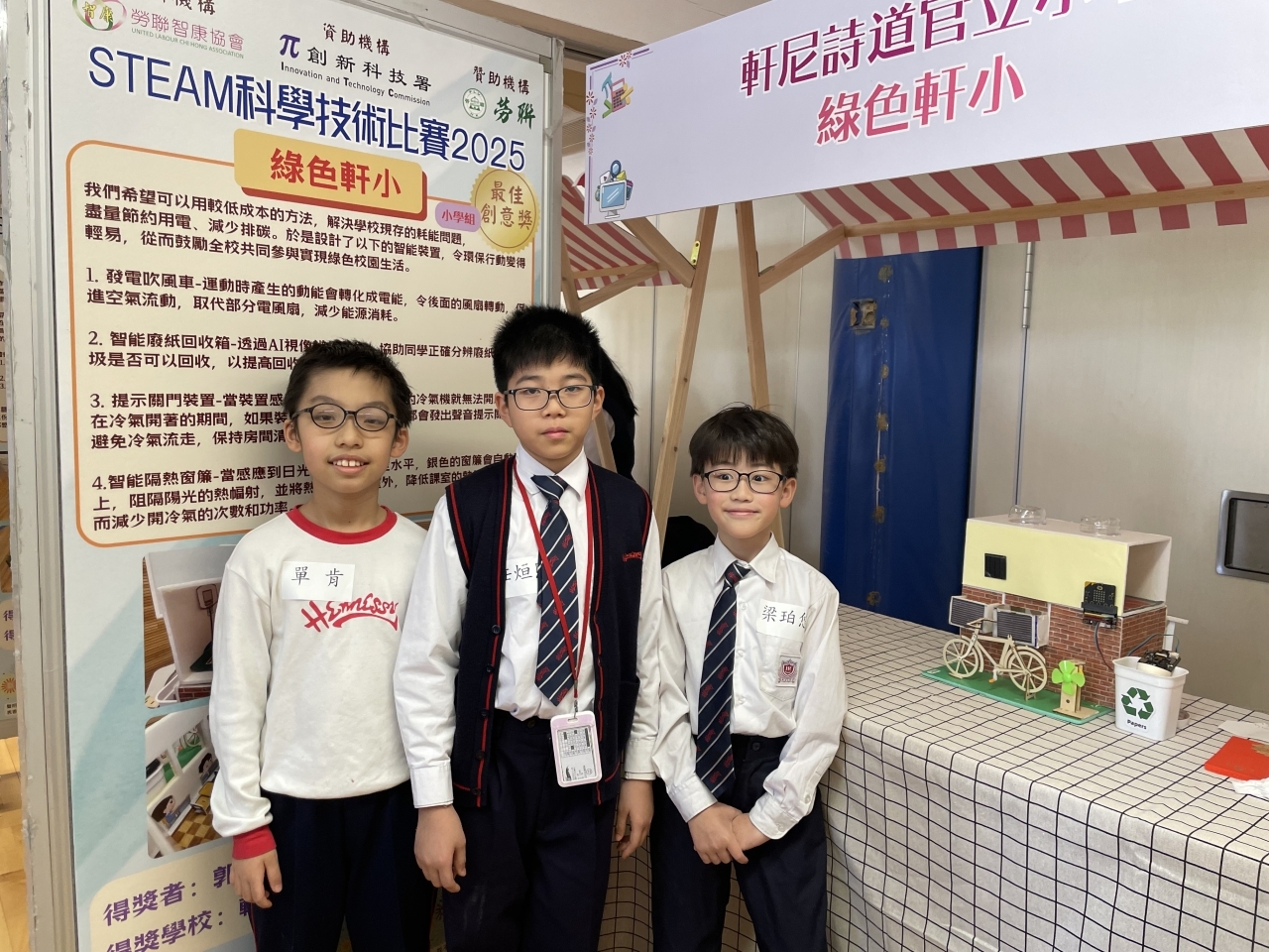 本校4位STEAM校隊的成員早前參加由勞聯智康協會舉辦的「STEAM科學技術比賽2025」。他們以「綠色校園」為題製作模型,並運用micro:bit編程來設計智能環保裝置。同學們發揮堅毅的精神,不斷改良作品,最終獲得最佳創意獎。