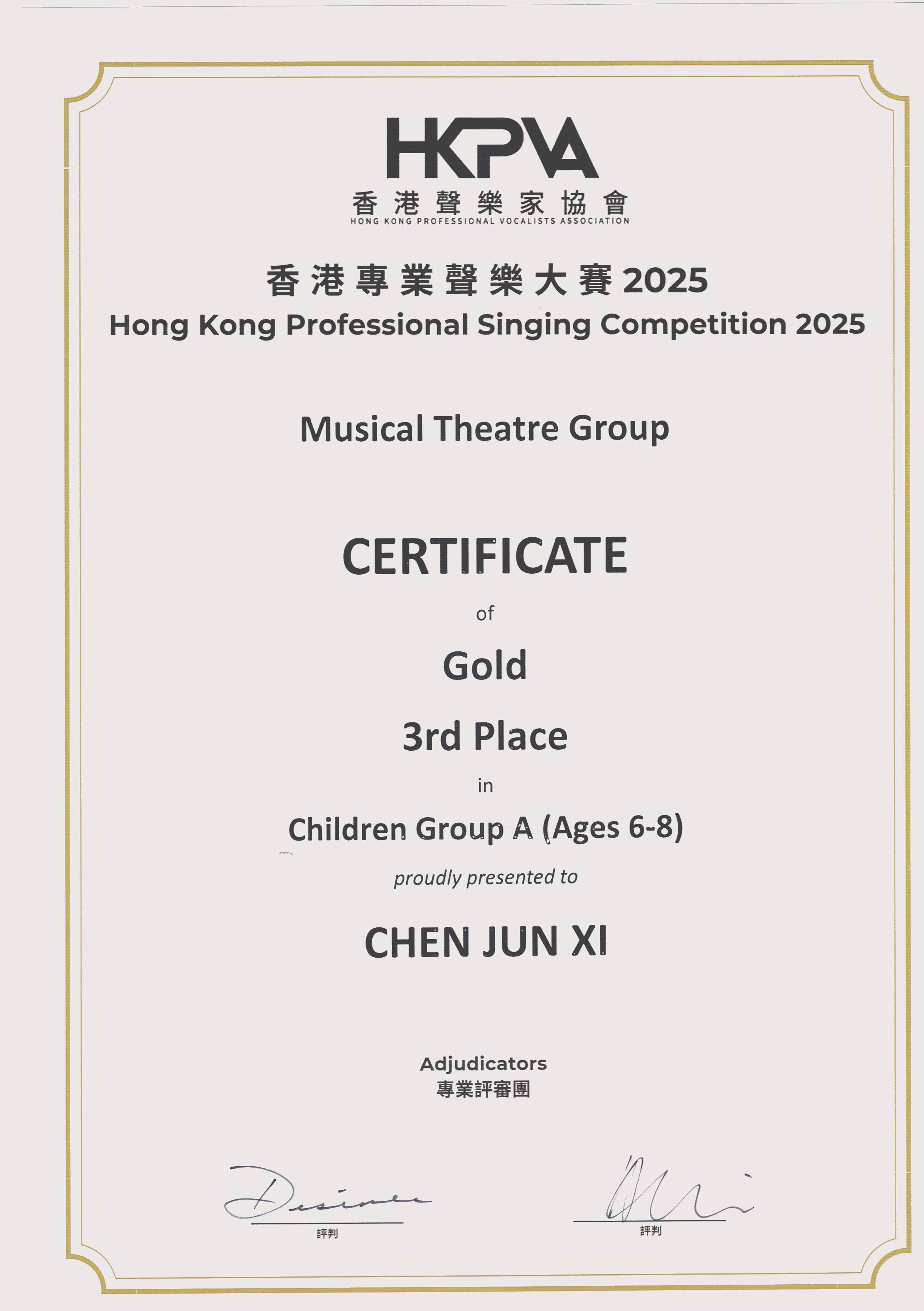 兒童A組(6-8歲) 金獎(第三名)舉辦日期:22/11/2025主辦機構:香港聲樂家協會 -