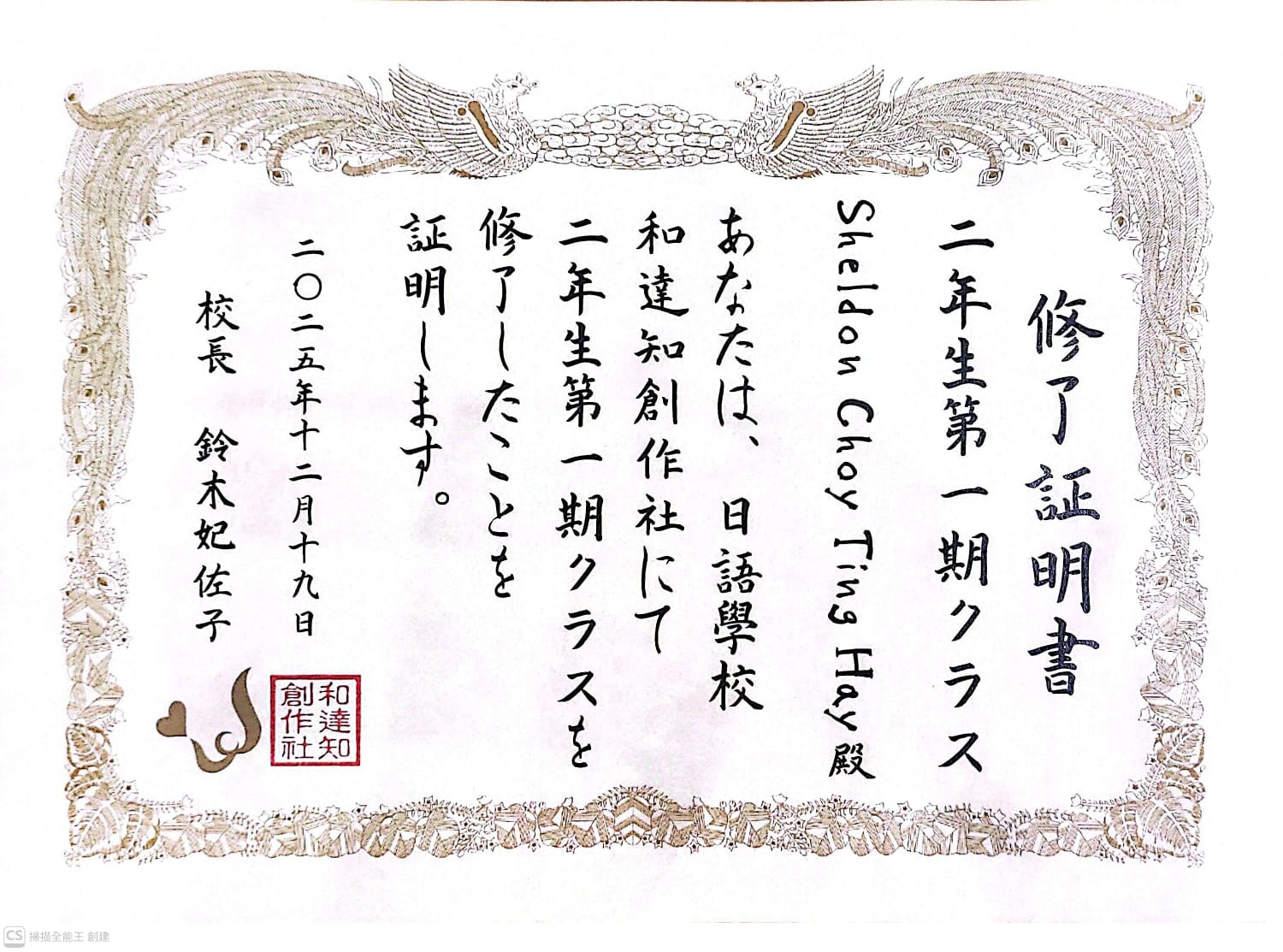 二年生第一期 合格舉辦日期:29/12/2025主辦機構:日語學校和達知創作社 -