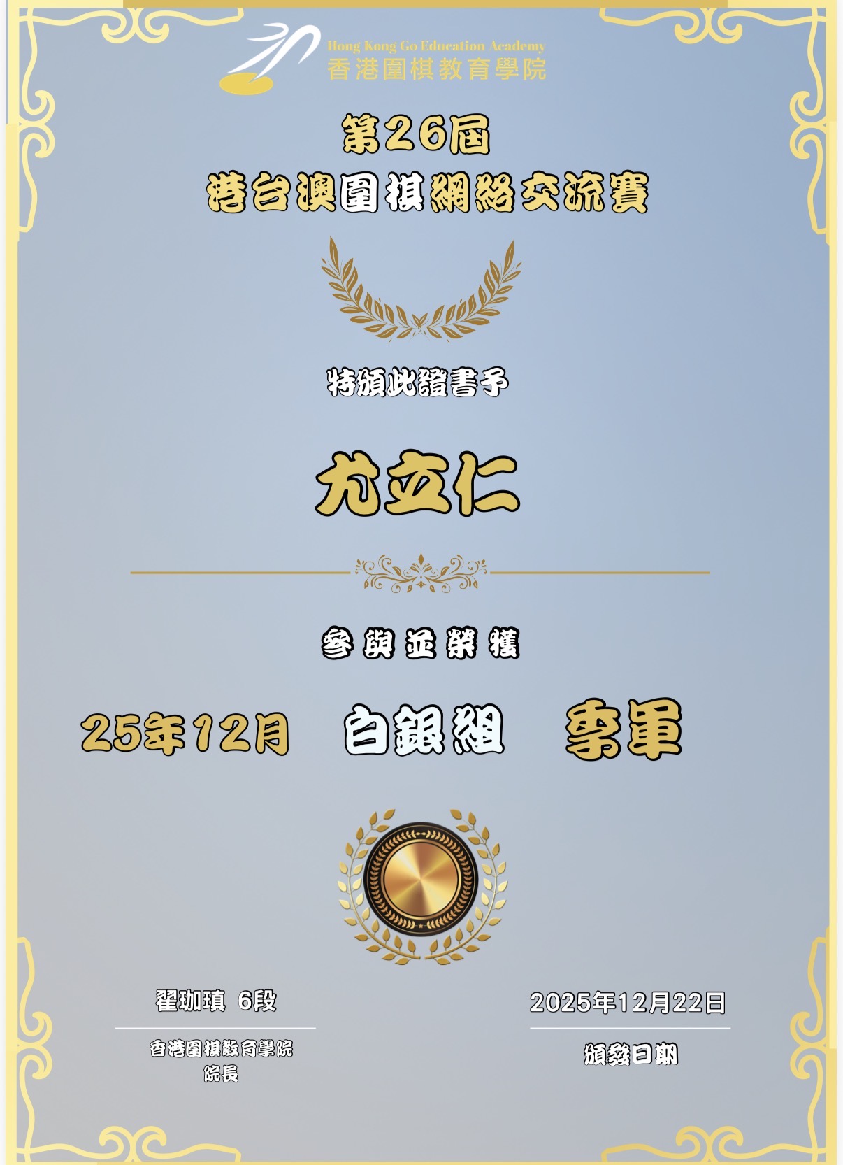 白銀組 季軍舉辦日期:22/12/2025主辦機構:香港圍棋教育學院 -