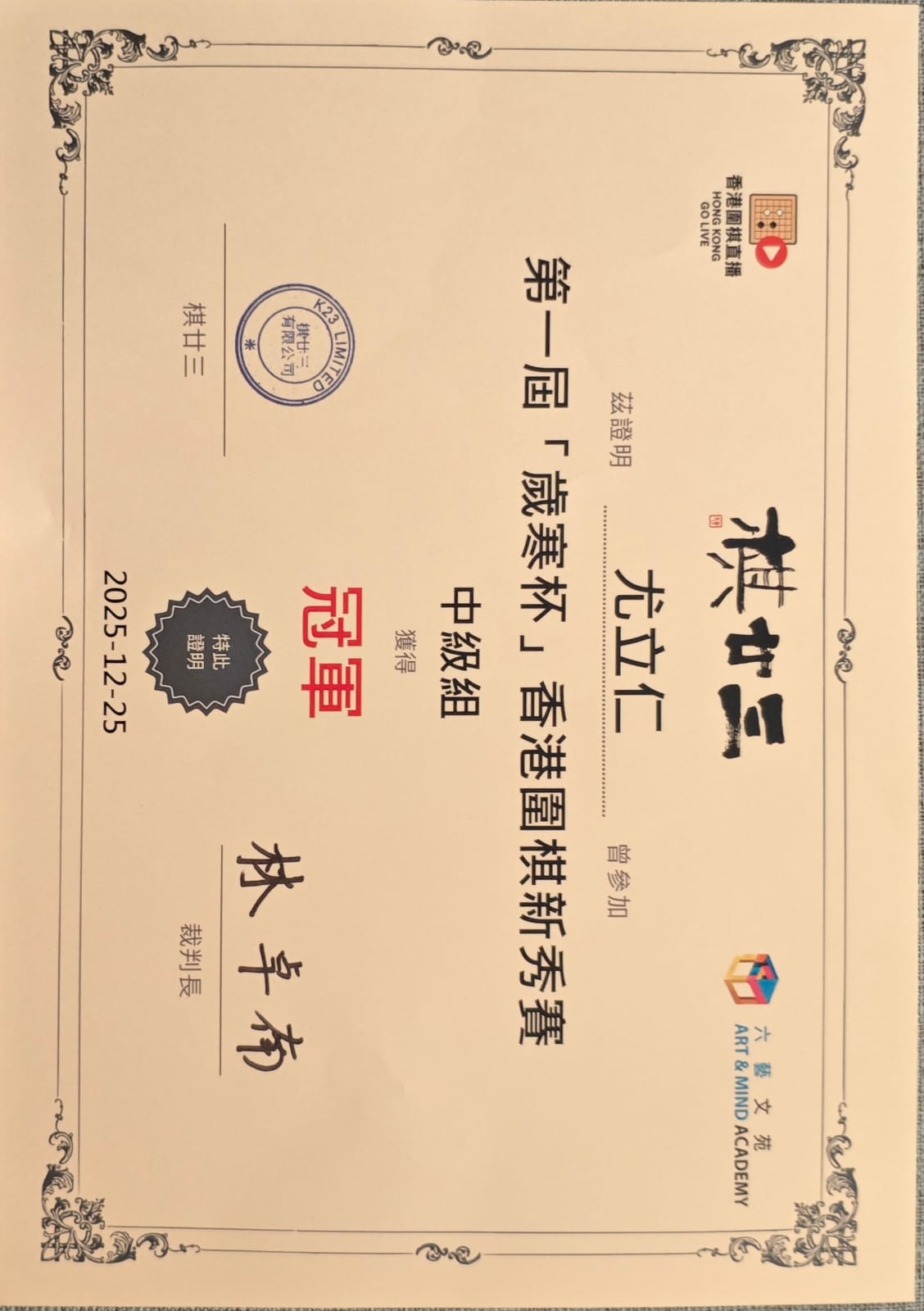 中級組 冠軍舉辦日期:25/12/2025主辦機構:棋廿三 -