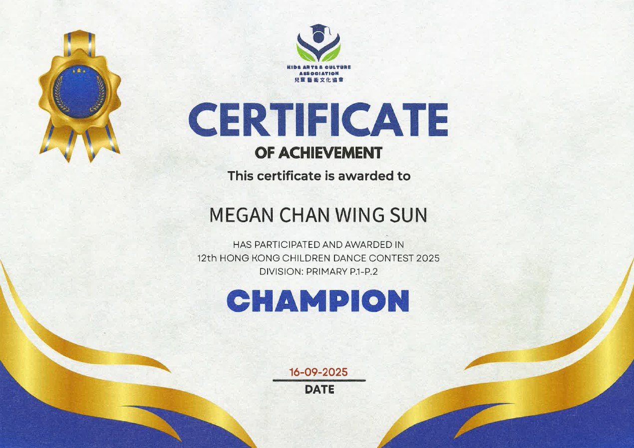 小一及小二組(個人) 冠軍舉辦日期:16/09/2025主辦機構:兒童藝術文化協會 -